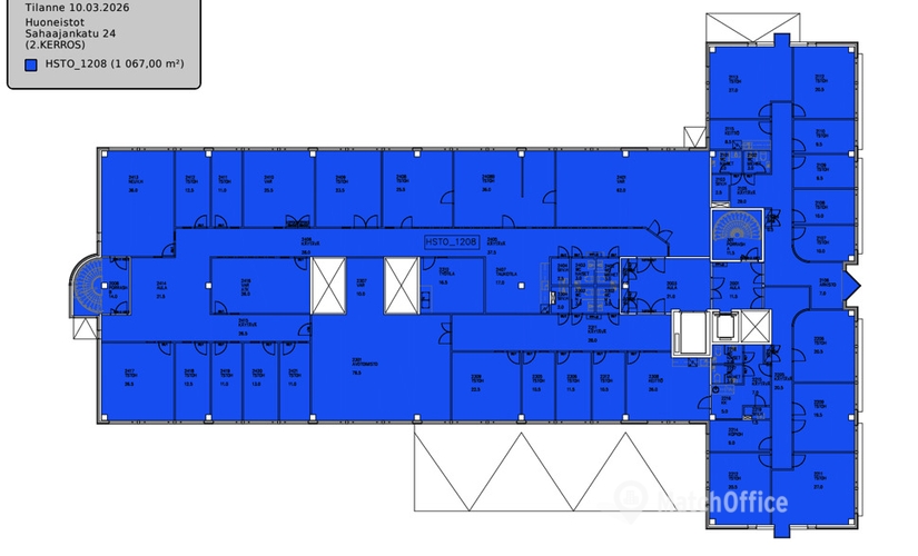 Tämä 1067 m² toimistotila kattaa kiinteistön 2. kerroksen. Toimisto on pääosin huoneellinen, ja siihen kuuluu useita wc- ja keittiötiloja. Kerros on mahdollista jakaa useammalle käyttäjälle, 291 m² 362 m² ja 354 m² kokoisiin osiin.